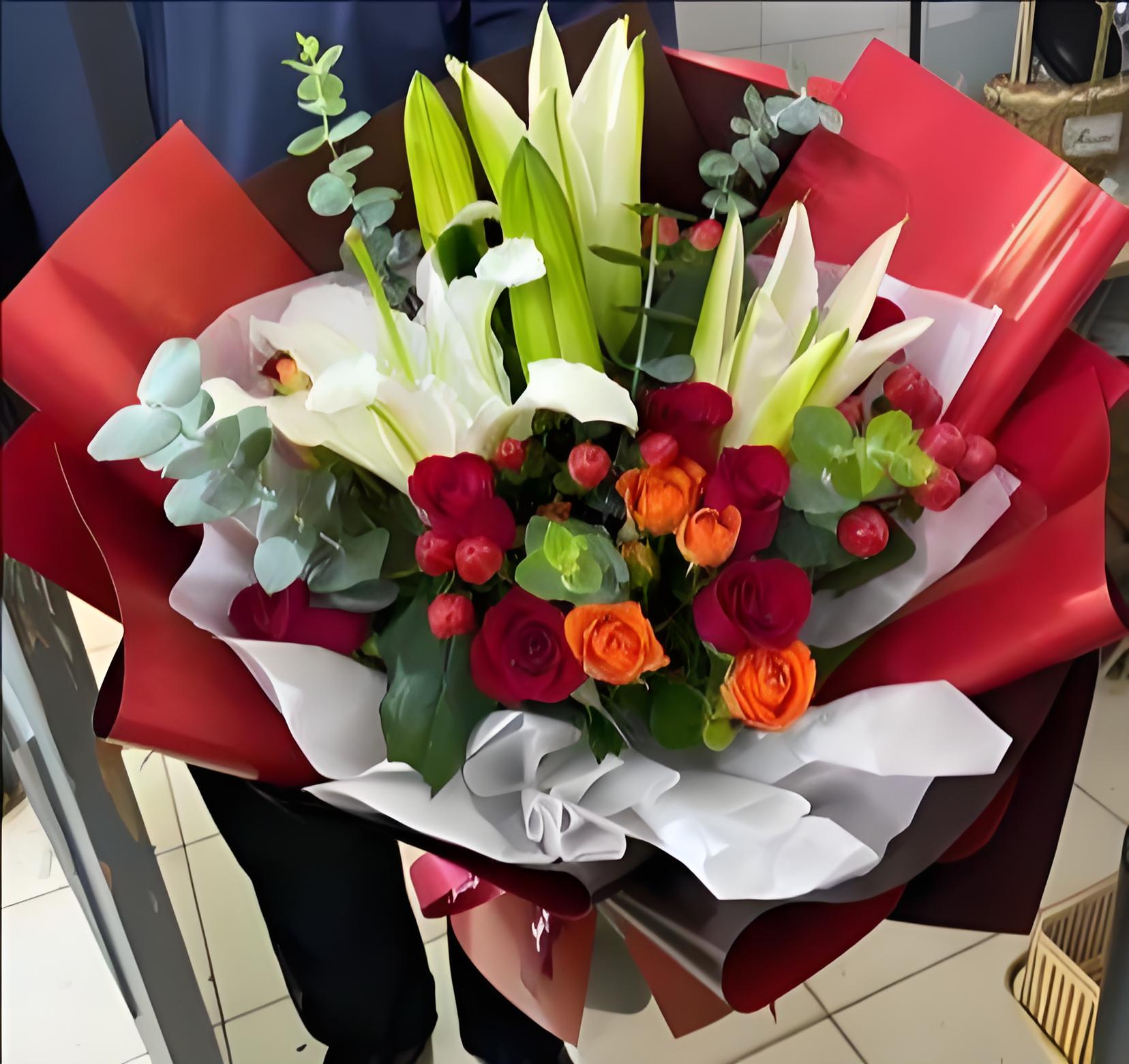 鄂尔多斯东胜区花店包11枝红玫瑰、2枝多头白百合、6枝橙色多头玫瑰、红豆、尤加利叶